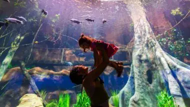 O tanque faz parte do percurso que conecta o rio ao oceano dentro do atrativo, reunindo diferentes ambientes de água doce e salgada. A proposta reforça o caráter educativo da visita e aproxima o público da biodiversidade marinha protegida no aquário. O clima natalino funciona como porta de entrada para despertar o interesse pela vida aquática e destacar a importância da conservação das espécies.