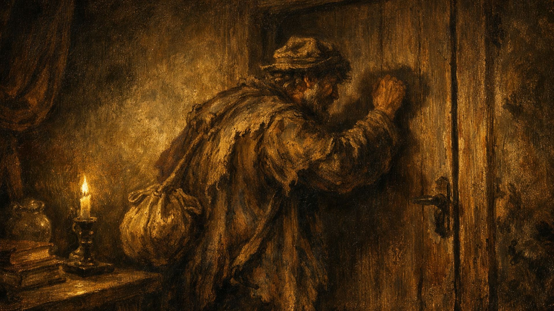 Ele entende aquilo como um pedido de ajuda. Os andrajos denunciam. Escancarando a porta, ele faz um gesto para o Espírito do Tempo entrar.